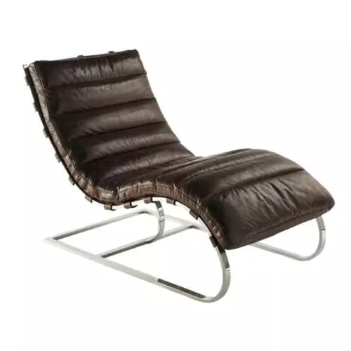 Pour un repos bien mérité, adoptez le fauteuil chaise longue cuir FREUD qui vous accueille avec son assise de cuir capitonné. Cuir marron vieilli, superbes arceaux en acier inoxydable, ce rocking chair de salon se distingue par un design optimal.
